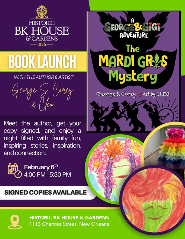 We invite you to meet the author, George S. Corey, and The Artist CLEO, at the launch of their newest children's book, "The Mardi Gras Mystery!" This exciting story follows two 8-year-old best friends, Georgie and GiGi, as they embark on a ghost hunt through the French Quarter and save Mardi Gras!